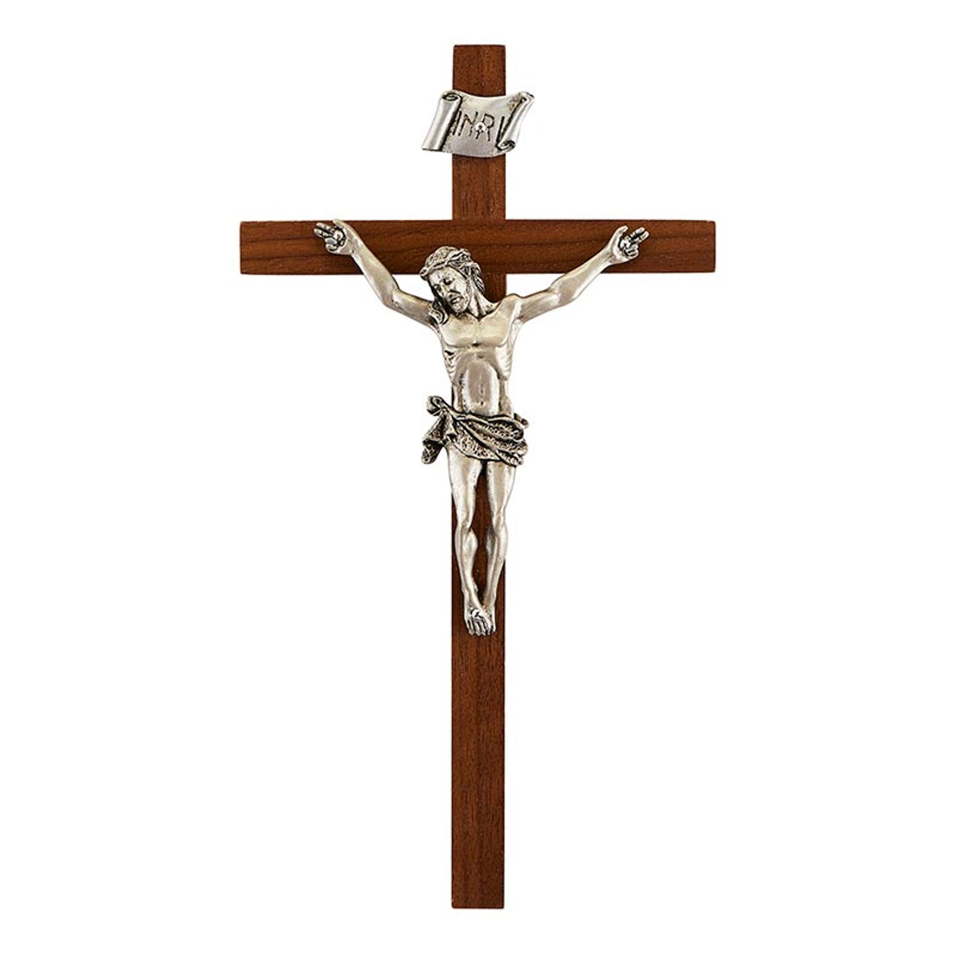 This crucifix is crafted using a walnut finish maple hardwood cross, antique pewter corpus and arrives gift boxed. Features intersecting two-piece construction and a keyhole on the back for hanging.