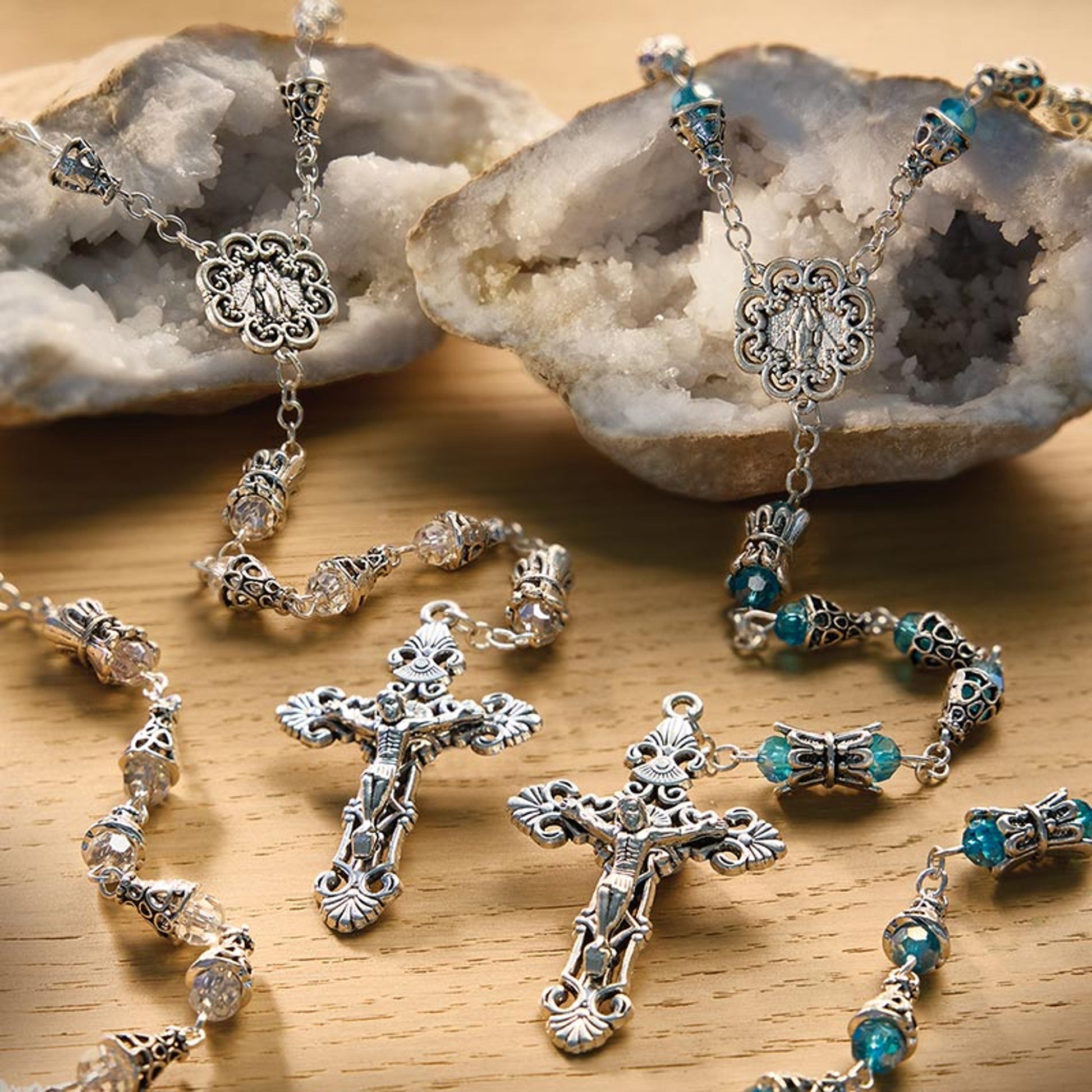 The Santiago de Compostela Collection honors the sacred pilgrimage to the shrine of Saint James - a journey of faith, penance, and devotion that has drawn Catholics for centuries. The silver filigree caps encasing each bead reflect the grandeur of the Botafumeiro, the censer that swings through the Cathedral of Santiago de Compostela, filling the sacred space with the fragrance of prayer. Shimmering crystal beads with an aurora borealis finish reflect the divine light that has guided countless pilgrims along the Camino, making these rosaries a symbol of spiritual endurance and heavenly grace.