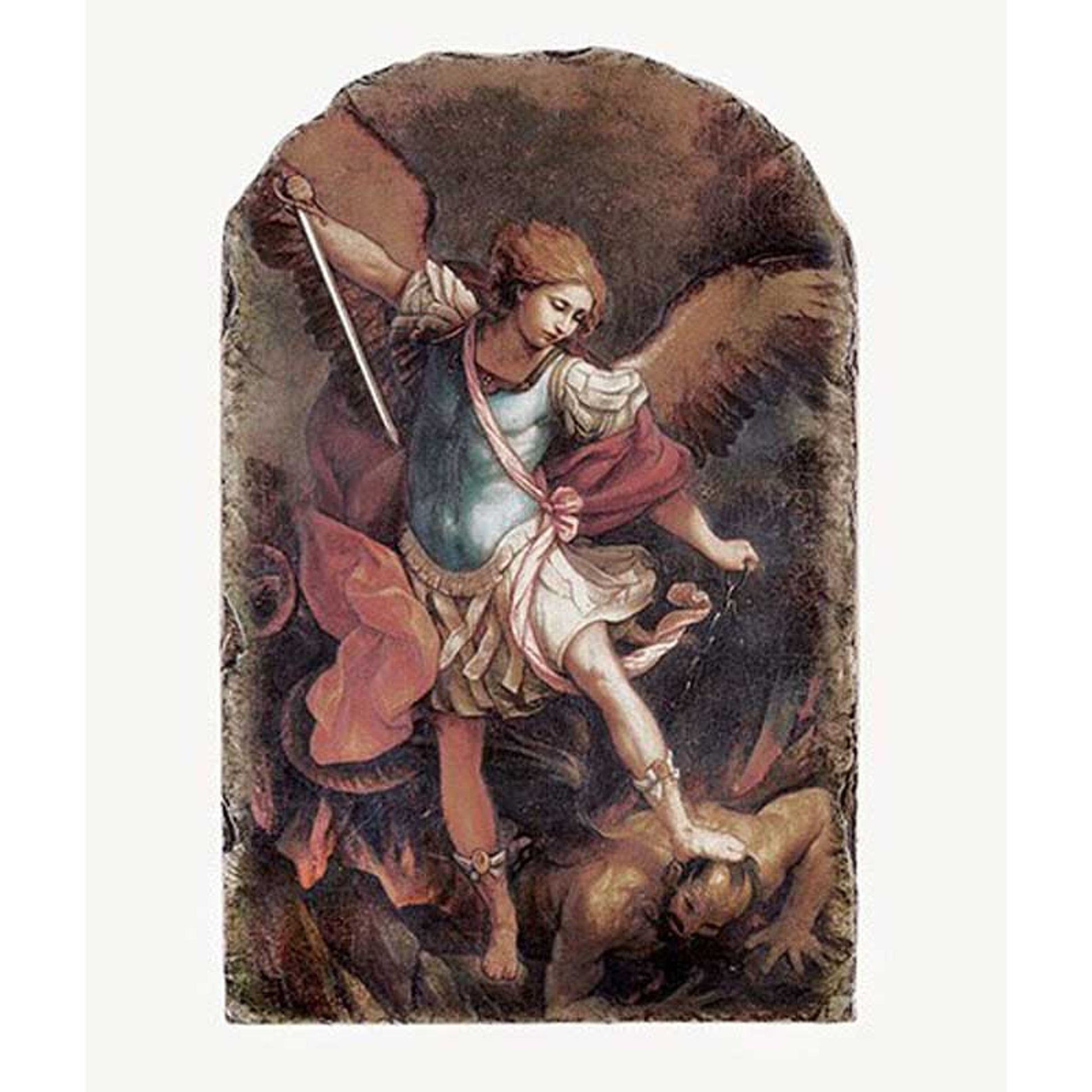 This St. Michael the Archangel embossed relief tile plaque is a beautiful painting and ideal for a special prayer corner in the home. This artistic adaptation of the guardian and protector of the heavens and church comes with a wire stand for tabletop use and a keyhole hanger for the wall.