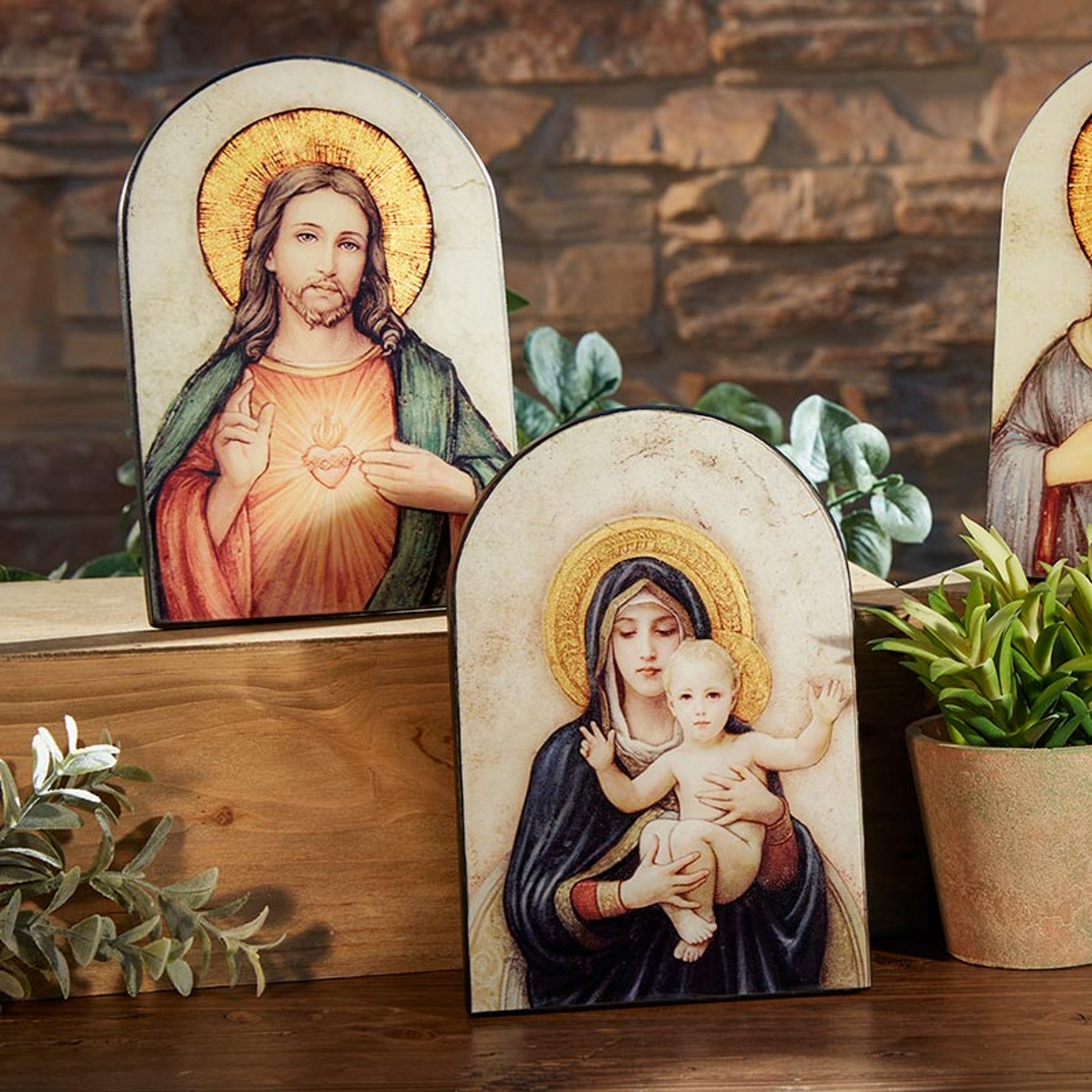 These arched plaques feature painted wood accented with rich gold tones and include an easel for standing and a hook for hanging.
