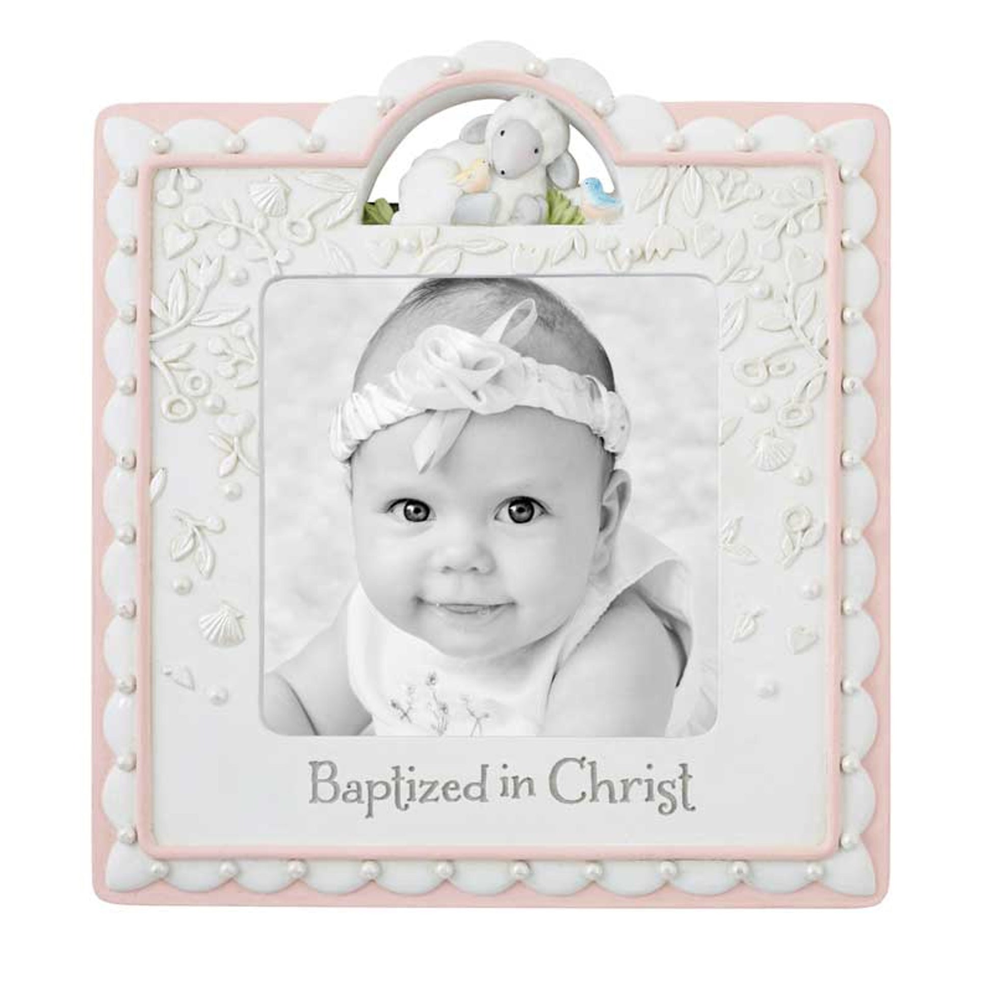 Delicate pink and blue hues and pearlized paint details enhance these exceptional baptism gifts from Avalon Gallery's Baptized in Christ Collection. This elegant, adorable and very cheerful collection is gift boxed for gifting on the infants special day. This pink photo frame will forever capture the excitement and wonder of the special day. Beautifully sculpted with the image of a sheep and inscribed with the words - Baptized in Christ. Holds 4" x 4" photo.