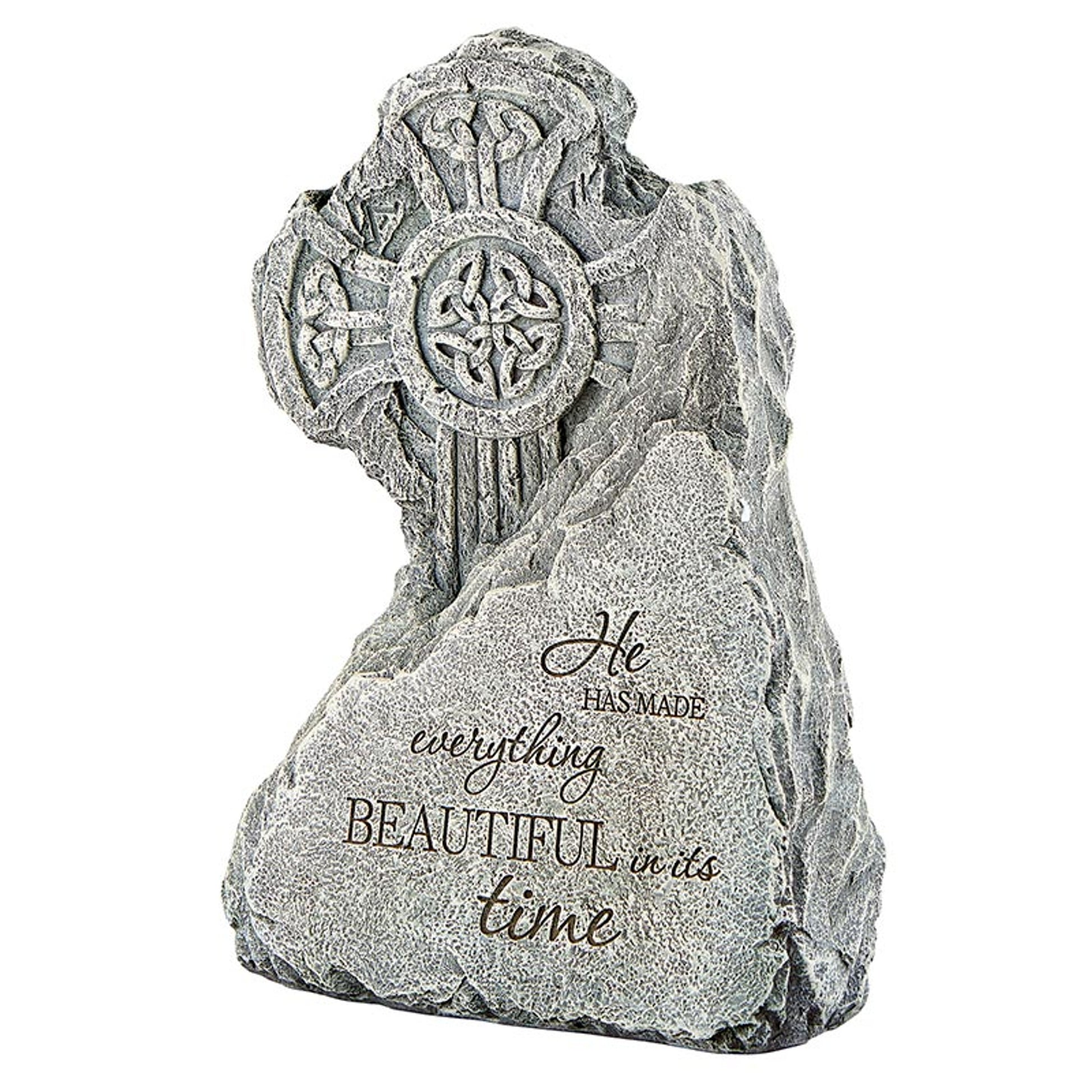 Elevate your garden with the Celtic Stone Garden Cross, a meaningful gift for St. Patrick's devotees. Crafted from natural stone resin, it showcases the inspiring prayer: 'He has made everything beautiful in its time.' - Ecclesiastes 3:11. Add a touch of spiritual beauty to your outdoor space with this timeless piece.
