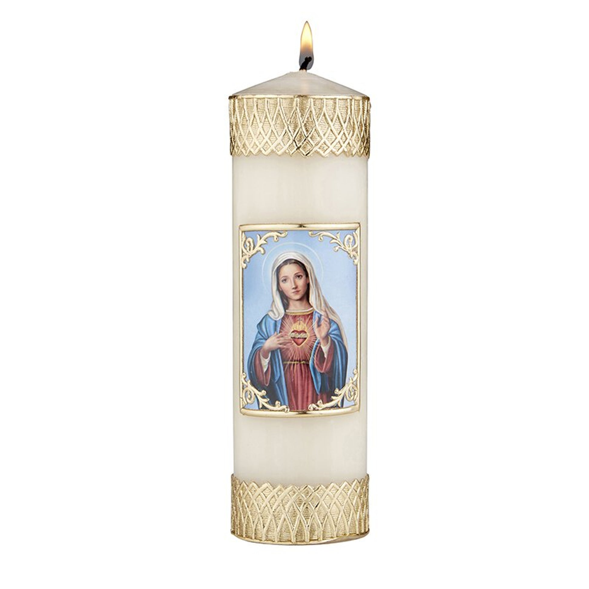 This beautifully detailed devotional candle from Will & Baumer???? is hand-decorated with a metallic gold wax and features an image of the Immaculate Heart.