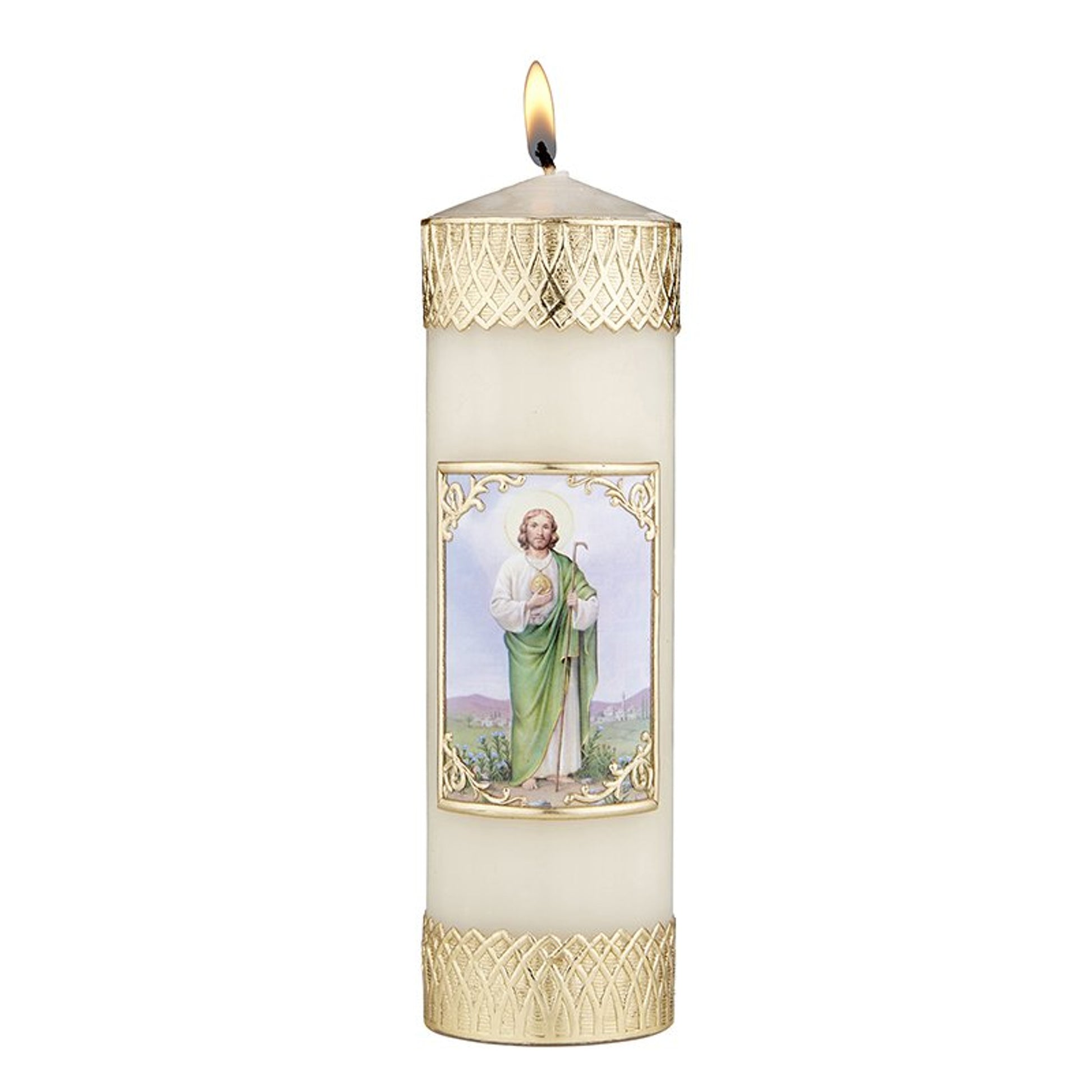 This beautifully detailed devotional candle from Will & Baumer???? is hand-decorated with a metallic gold wax and features an image of St. Jude.