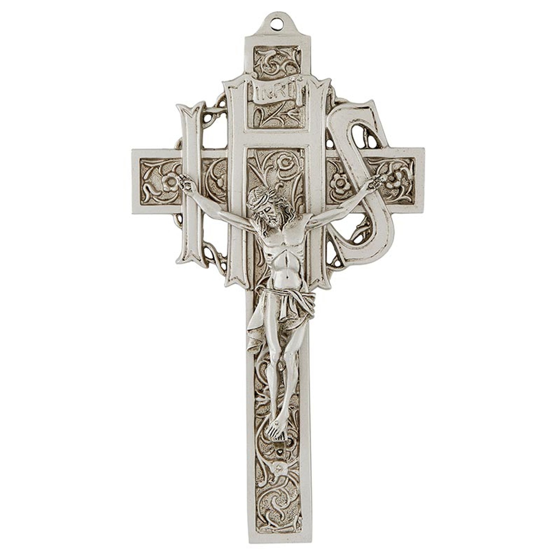 This 9 inch tall solid pewter crucifix features a 4-3/4 inch corpus with pewter finish, "IHS" central motif, the INRI sign and beautiful scrolling filigree background. Gift Boxed.