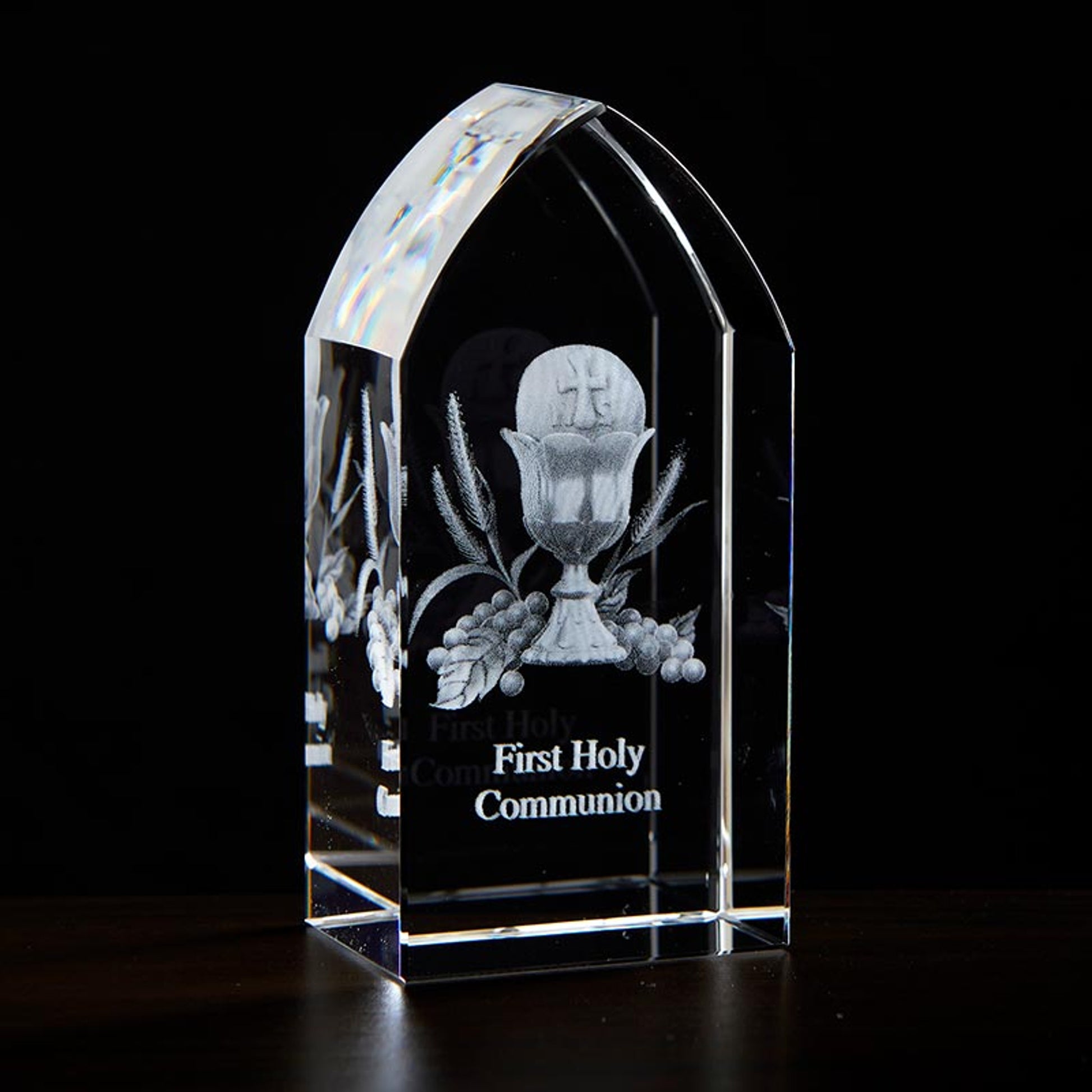 This Etched Glass Stand from Jeweled Cross features a 3D image of First Communion chalice in the center. The crystal clear look makes it a good home d??cor.