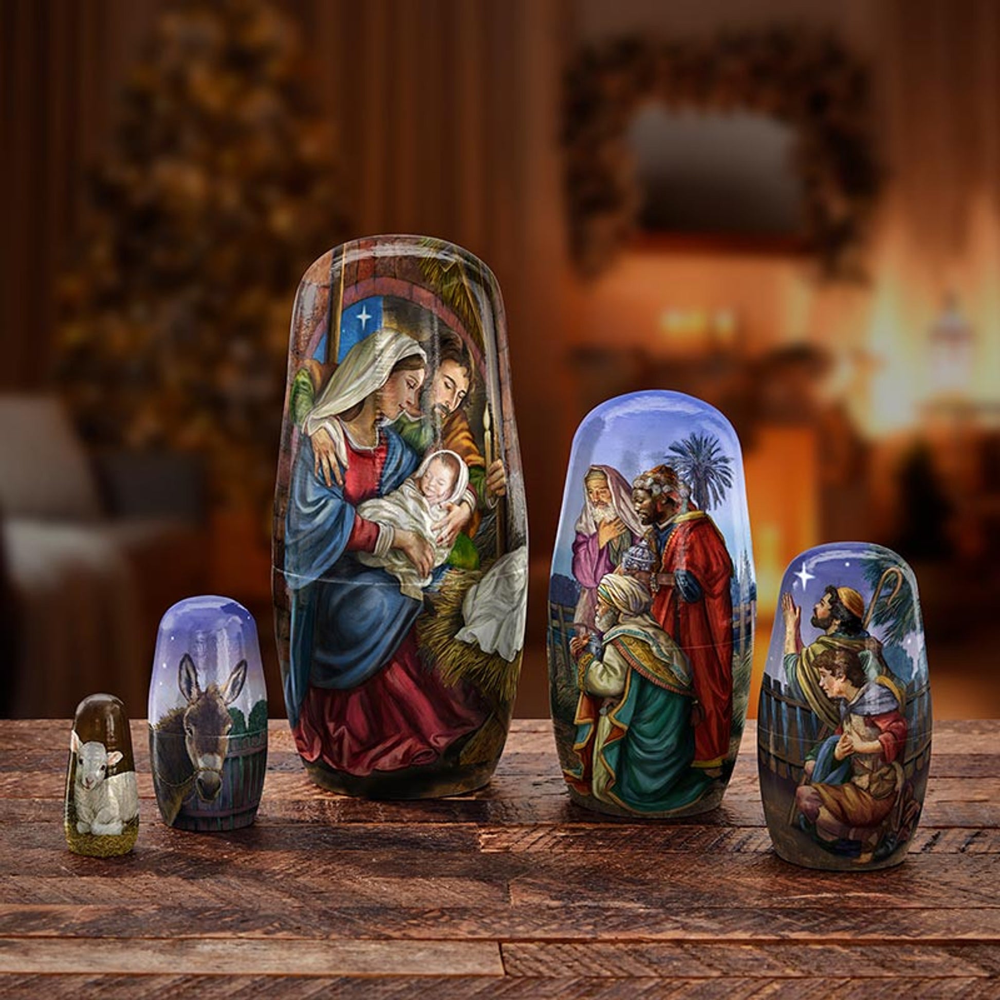 The Nativity story is retold with these unique illustrated nesting dolls featuring Michael Adams' signature art. Watch your family engage with the birth of Christ as they unpack these wooden dolls. This set depicts five characters from the Christmas story -- the Holy Family, the wise men, the shepherds, a donkey, and a lamb to represent the Lamb of God. Unpack this heartwarming story for generations to come!