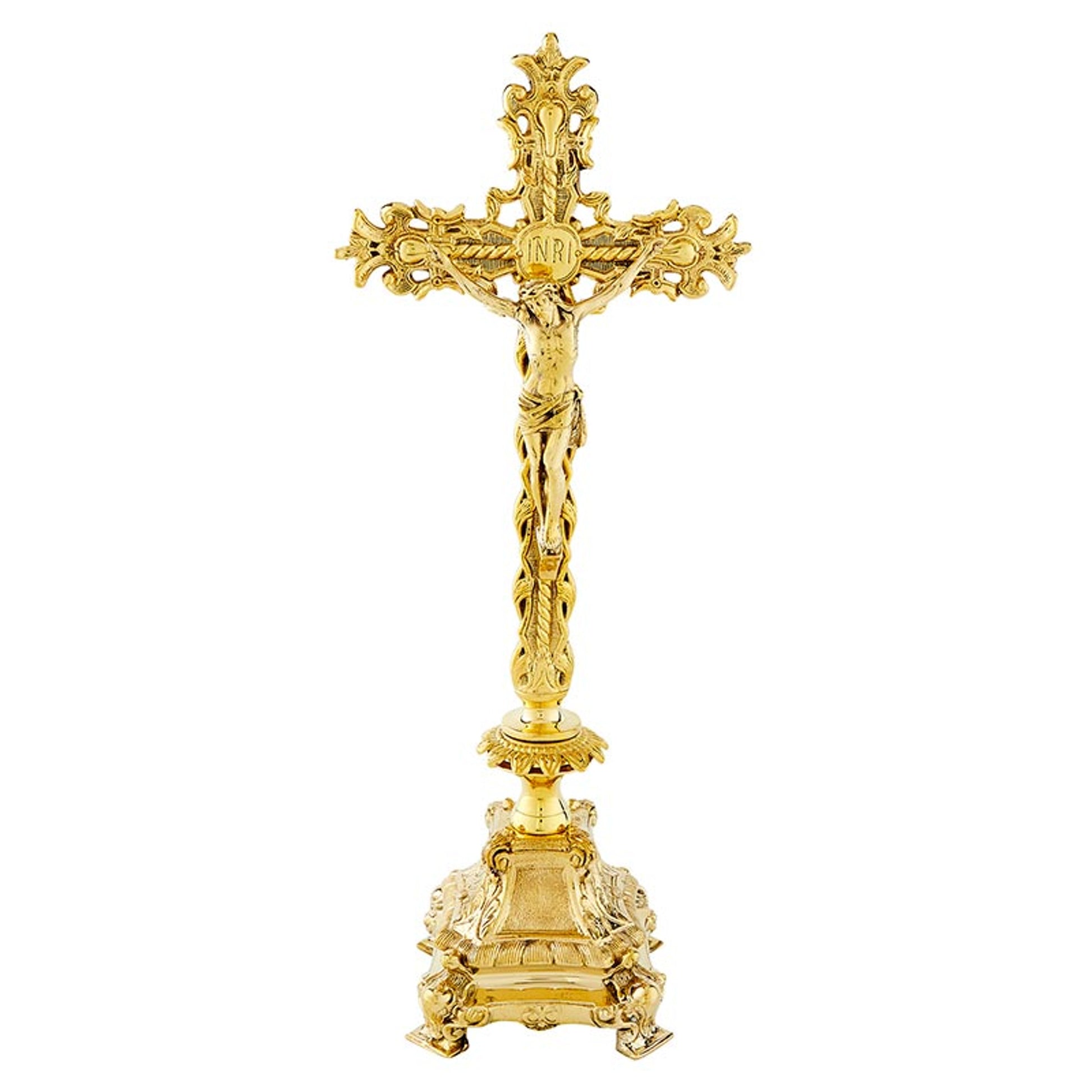 Size: Crucifix: 16-1/2" H , 4-1/4" W Base, 10" H Crucifix, Candlestick: 5-1/2" H , 4-1/4" W Base, 2" Dia Socket