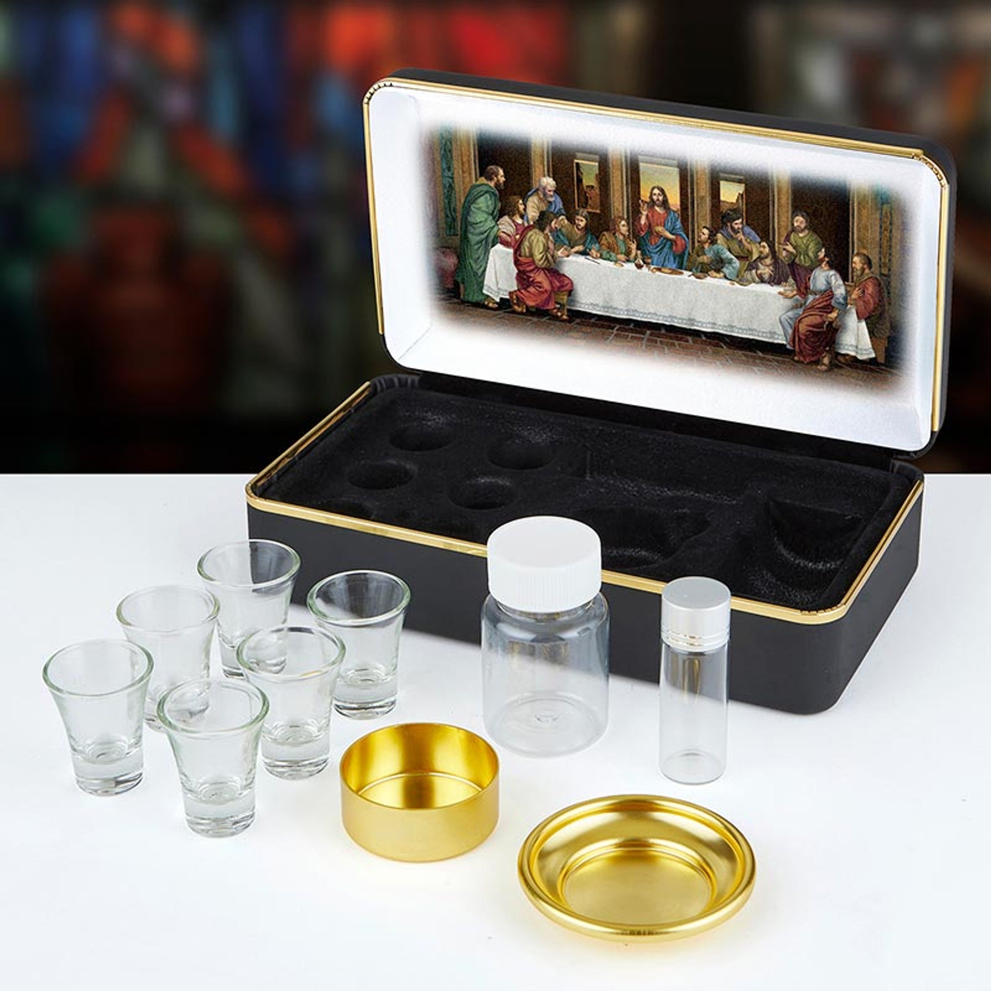 The cruet set with an IHS design come with glass stoppers to help keep the contents sealed snugly. This cruet set from Sudbury Brass features a curved handle and slightly tapered neck. Sold as a pair.Decorated with gold IHSHeat seal processed secure designSold in increments of 6