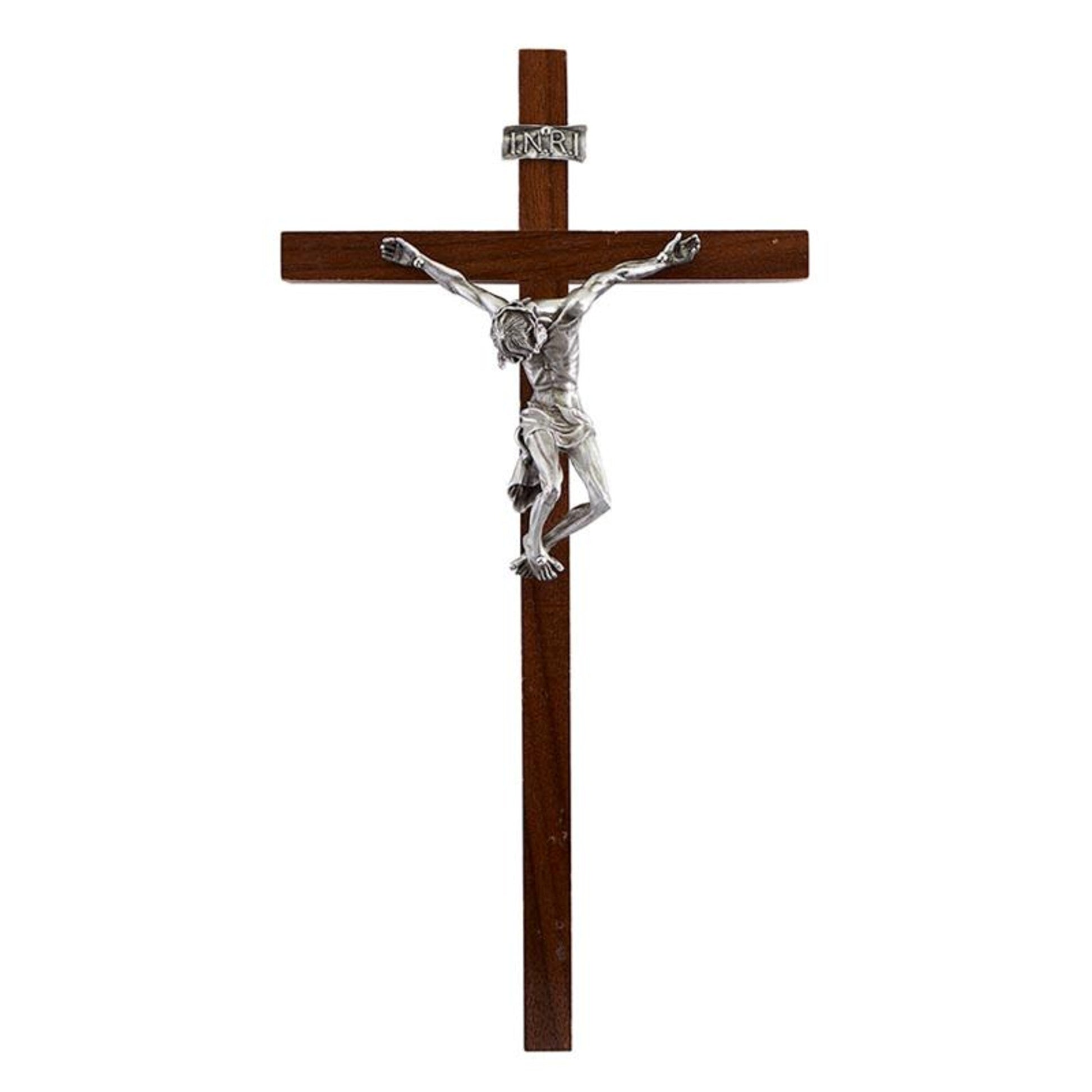 This Crucifix is 10" H and features antique pewter finish corpus on a maple hardwood cross.
