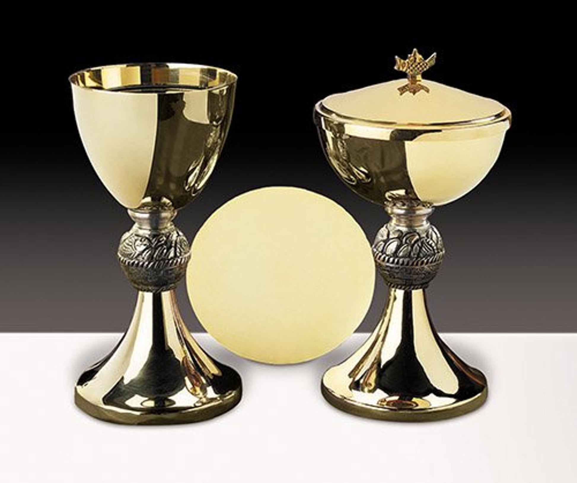 Our Loaves and Fish Chalice and Paten was exclusively designed and manufactured using only high quality materials. Each piece is crafted of lead-free, 100% food safe brass and then gold plated to meet our high quality standards. An etched loaves and fish node in an antique silver finish was added to create a very unique look. It is truly an exquisite set at an unbeatable value. Please also see our matching Loaves and Fish Ciborium with Cover (JC719).Care Instructions:Cleaning & Polishing Dust regularly with a soft, dry cotton or microfiber cloth. For deeper cleaning, use mild soap with lukewarm water; rinse and dry immediately. Occasionally polish with a soft silver-polishing cloth to restore shine. Never use abrasive pads, harsh polishes, or chemical cleaners.Tarnish Prevention Tarnish is natural over time; minimize it by storing items in an anti-tarnish cloth or airtight box. Avoid prolonged exposure to air, humidity, or direct sunlight. Do not leave liquids, food, or acidic substances on the surface for long.Storage & Handling Store in a cool, dry place. Wrap or place items separately to avoid scratches. Handle with clean, dry hands to prevent stains or dullness. For functional pieces (like trays or bowls), line with fabric or use liners to protect the plating.Note: With gentle cleaning, mindful storage, and occasional polishing, your brassware item will retain its brilliance for years.