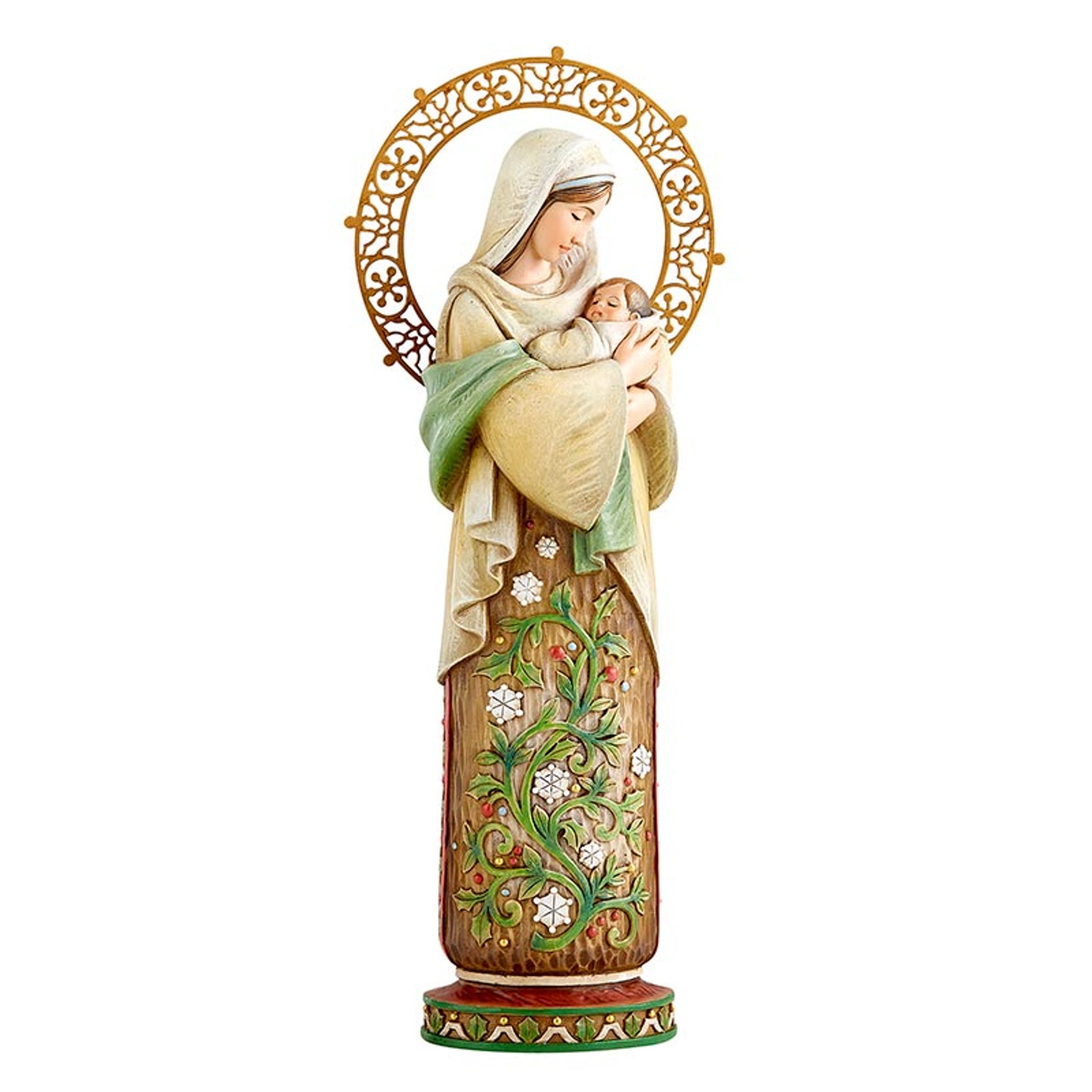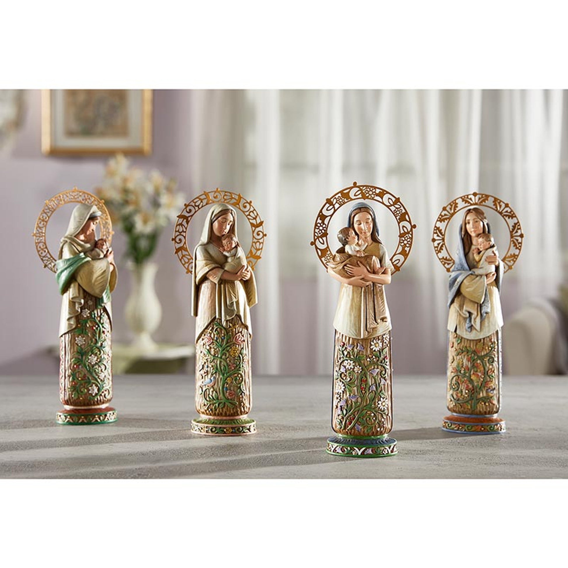 Each Madonna and Child figure is sculpted to look like wood, and subtly decorated in garments and floral designs of the season. Burnished metal halos of the season complete the look. Full round design.