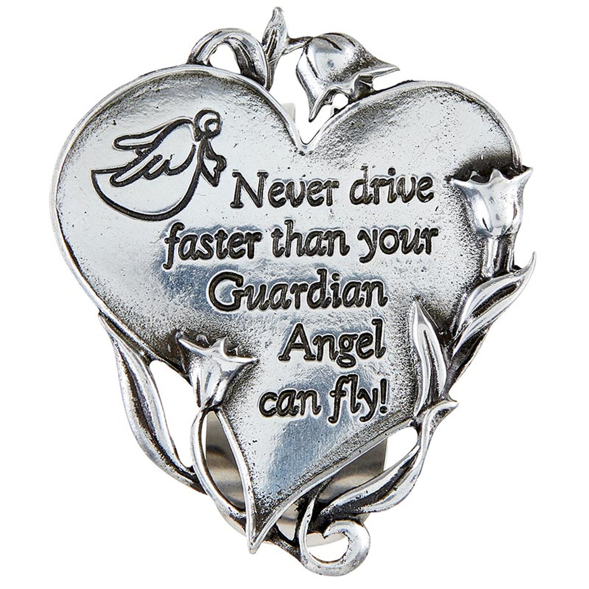Never drive faster than your Guardian Angel can fly." The heart shaped visor clip securely attaches to your car's visor to remind you to be a safe driver. The never drive faster visor clip is a great gift for new drivers!