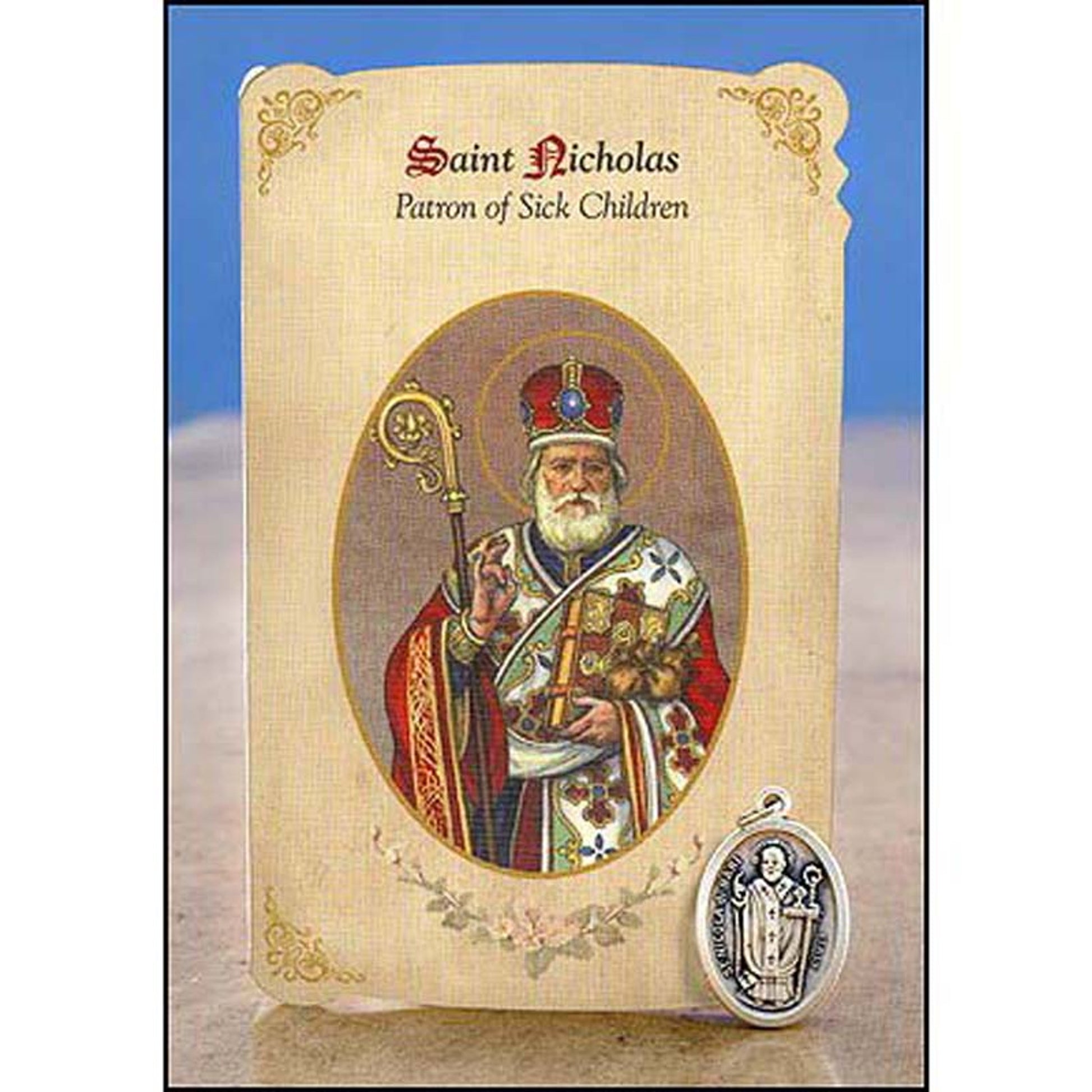 Saint Medal: Oxidized Silver 1" HIncludes a full-color holy card with two healing prayers, a saint biography and an oxidized silver patron saint medal. Saint Nicholas was born at Patara in Lycia, a province of Asia Minor, during the third century. His parents, who were devout Christians and extremely wealthy, died in an epidemic while Nicholas was still young. He used his entire inheritance to help the poor, the sick, and children in need. He often went about it in secret, expecting nothing in return. Nicholas was sent to live in a monastery and, at the age of 17, became one of the youngest priests ever. Before long, his charity and generosity became known throughout the land. Nicholas had dedicated his life to serving God and in the early part of the fourth century was made Bishop of Myra. It was said that he was not just able to nurse sick children back to health; he could raise them from the dead. He died in 342 and is recognized today as the protector and patron of all children - sick or healthy. His feast day is December 6th. Saint Nicholas, Pray for Us.