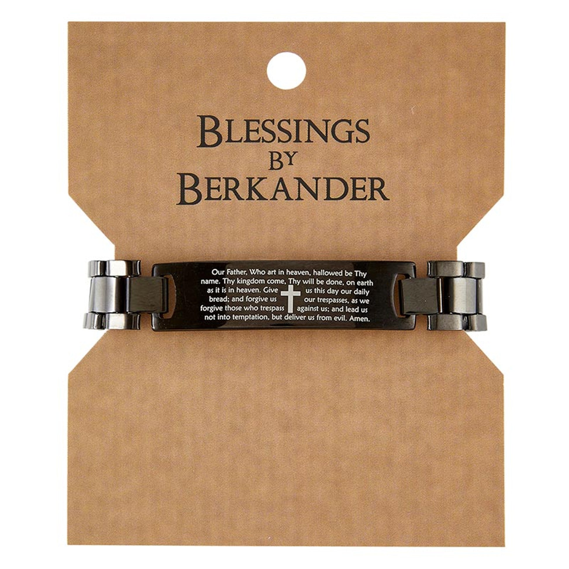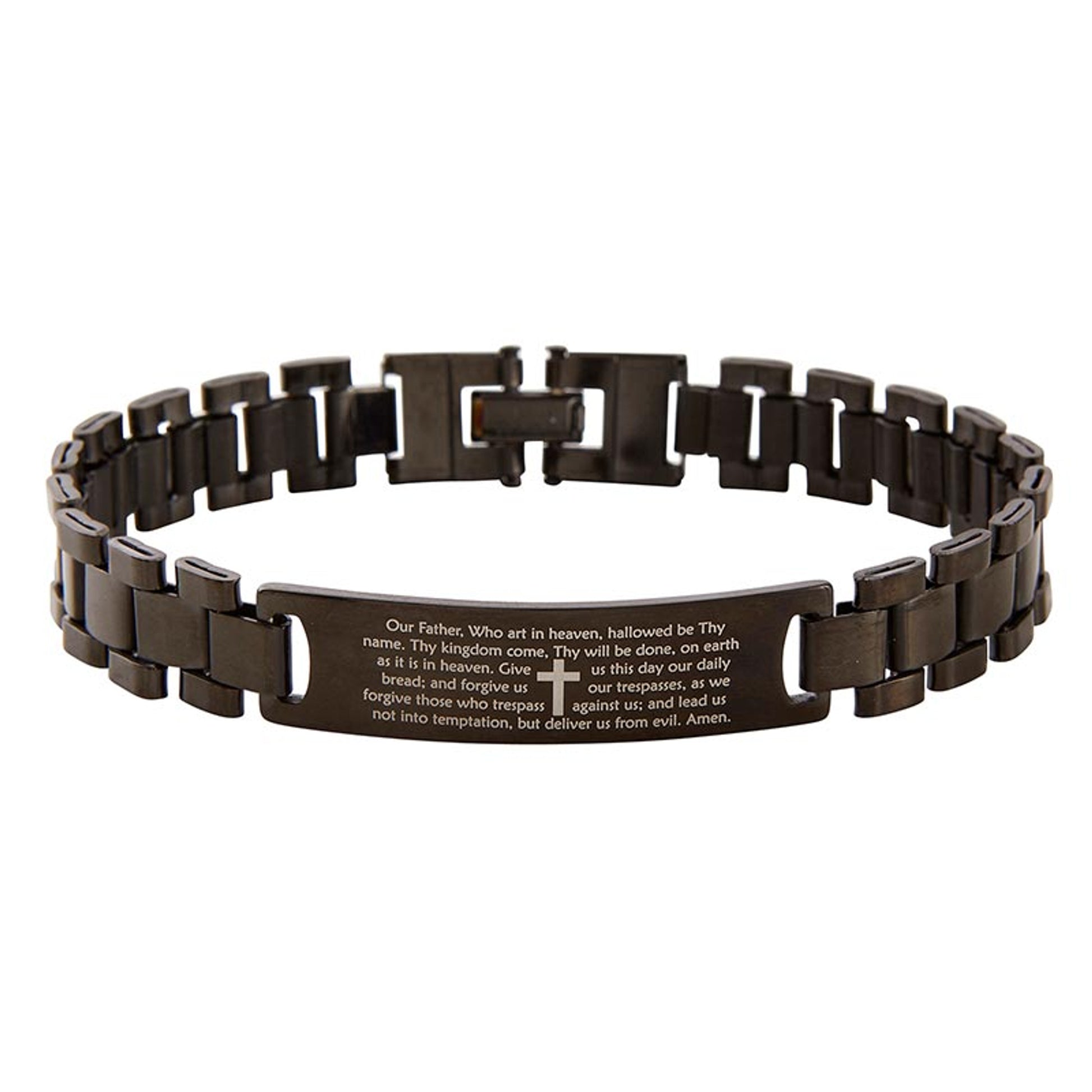 This striking watch band style bracelet features the Our Father prayer engraved onto the surface. Fits most men's wrists. Comes in a burlap bag, perfect for gift giving.