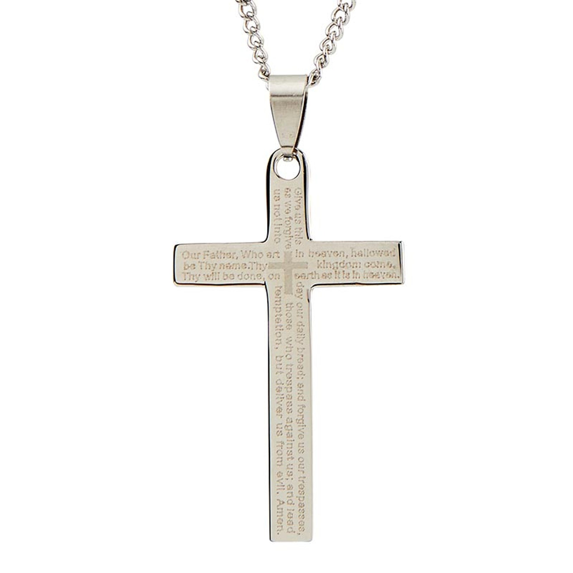 Wherever you go, carry the powerful words of the Our Father prayer lasered onto the stainless steel cross pendant of this necklace, ensuring it's always close to your heart.
