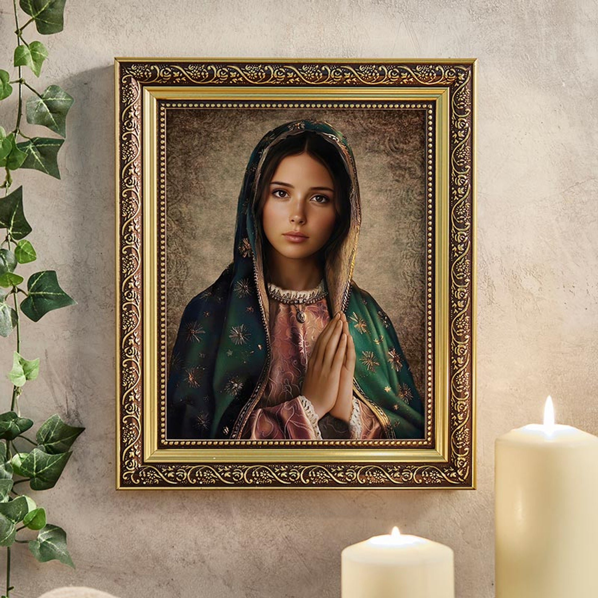 This piece of Our Lady of Guadalupe portrays Mary with her hands united in prayer, radiating compassion and advocacy. Her serene expression invites reflection, reminding us of her unwavering support and love for humanity.
