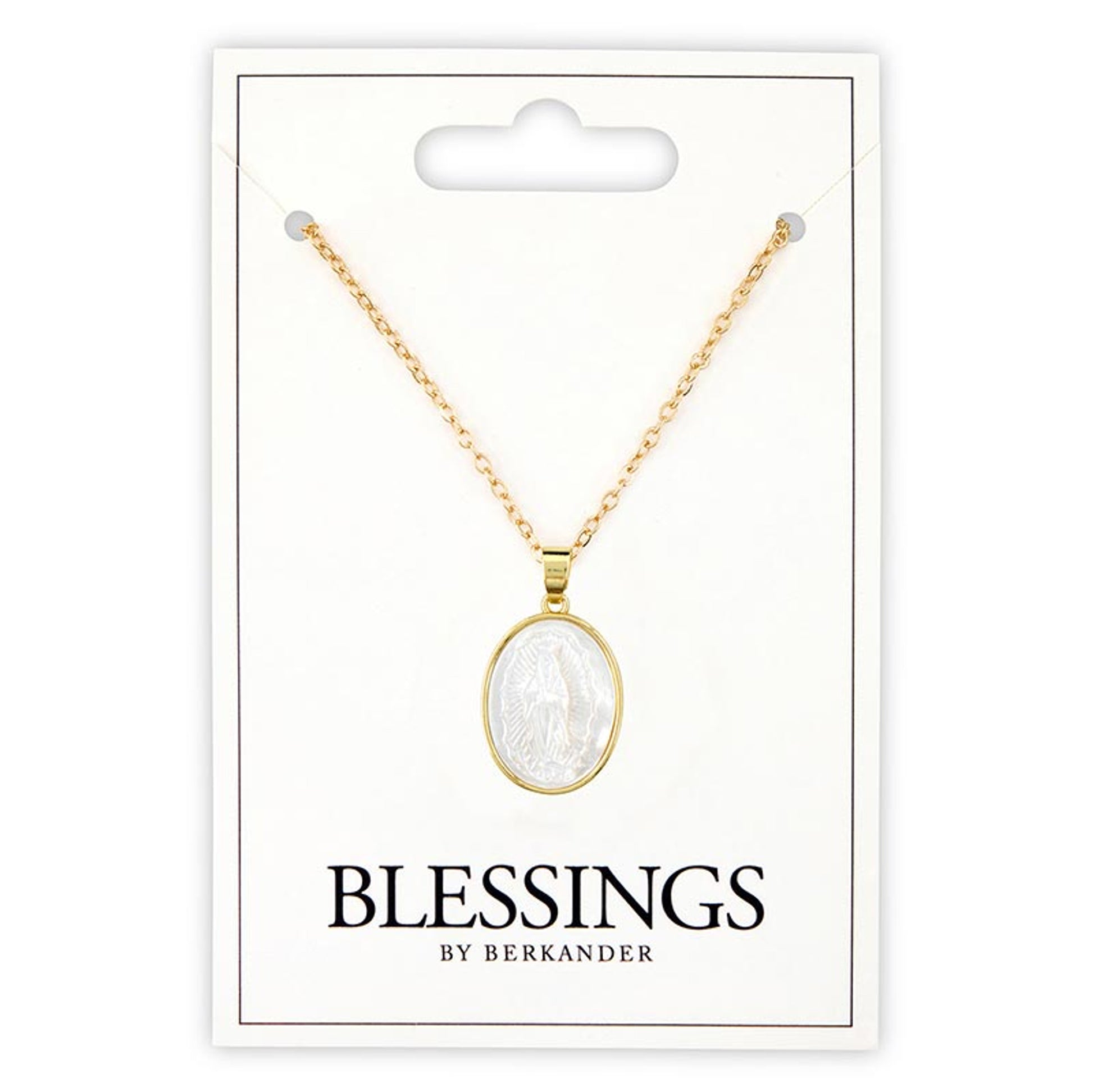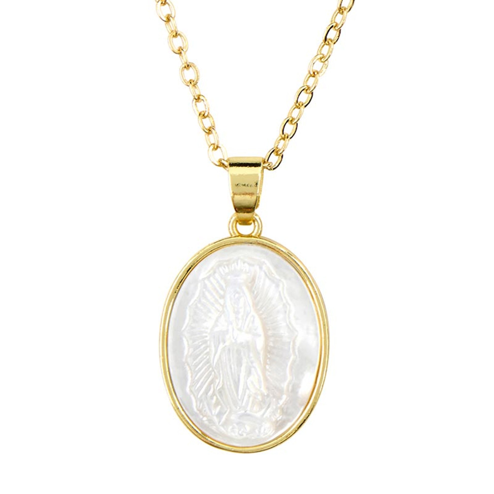 This plated gold necklace features a stunning faux mother-of-pearl pendant of the Virgin Mary, beautifully combining elegance and devotion in a timeless design.