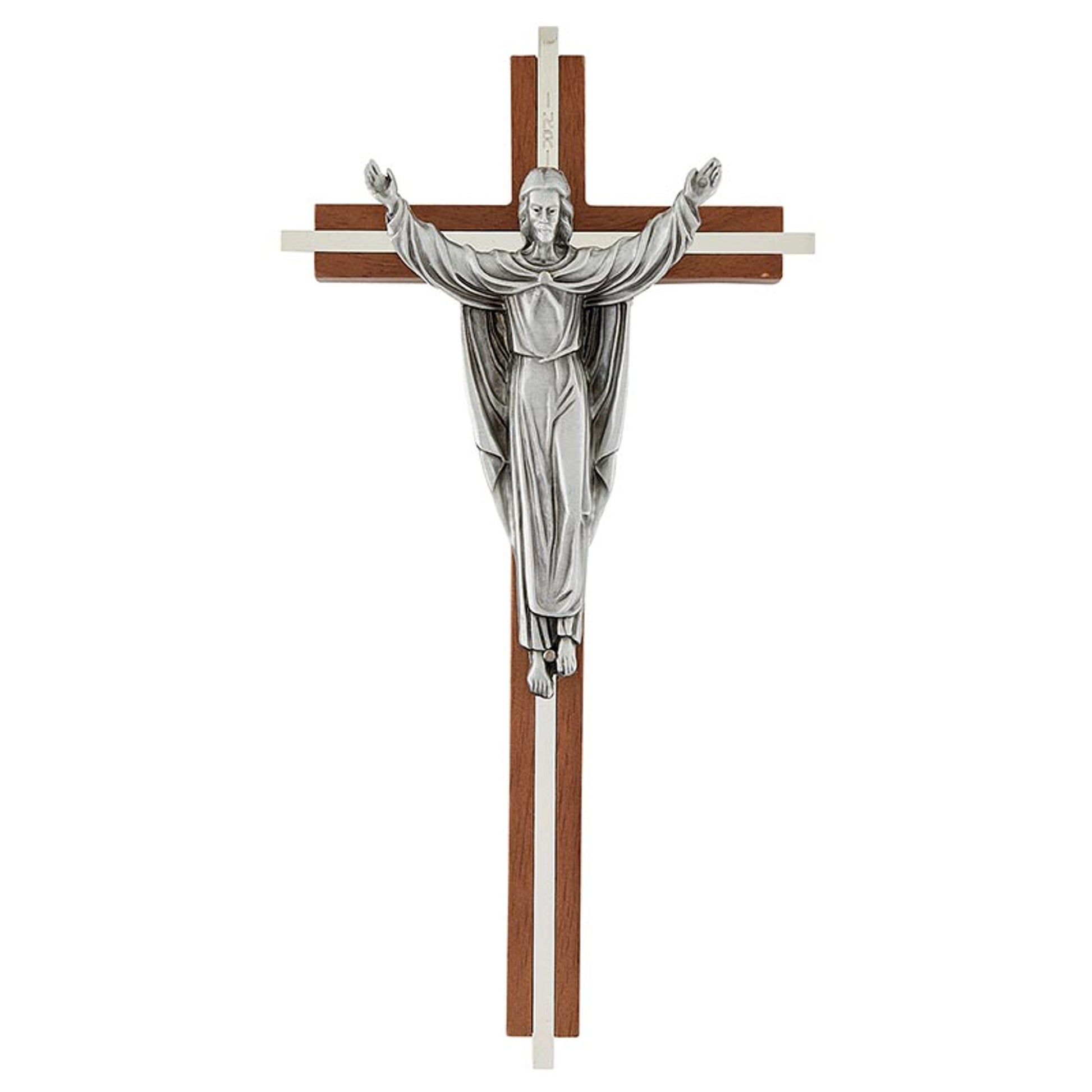 This cross from Jeweled Cross features a walnut finish cross, a Risen Christ emblem, nickel plated inlay and is hand-finished in antique pewter. Comes in a 2-piece gift box for easy gift-giving and a keyhole on the back for easy hanging.