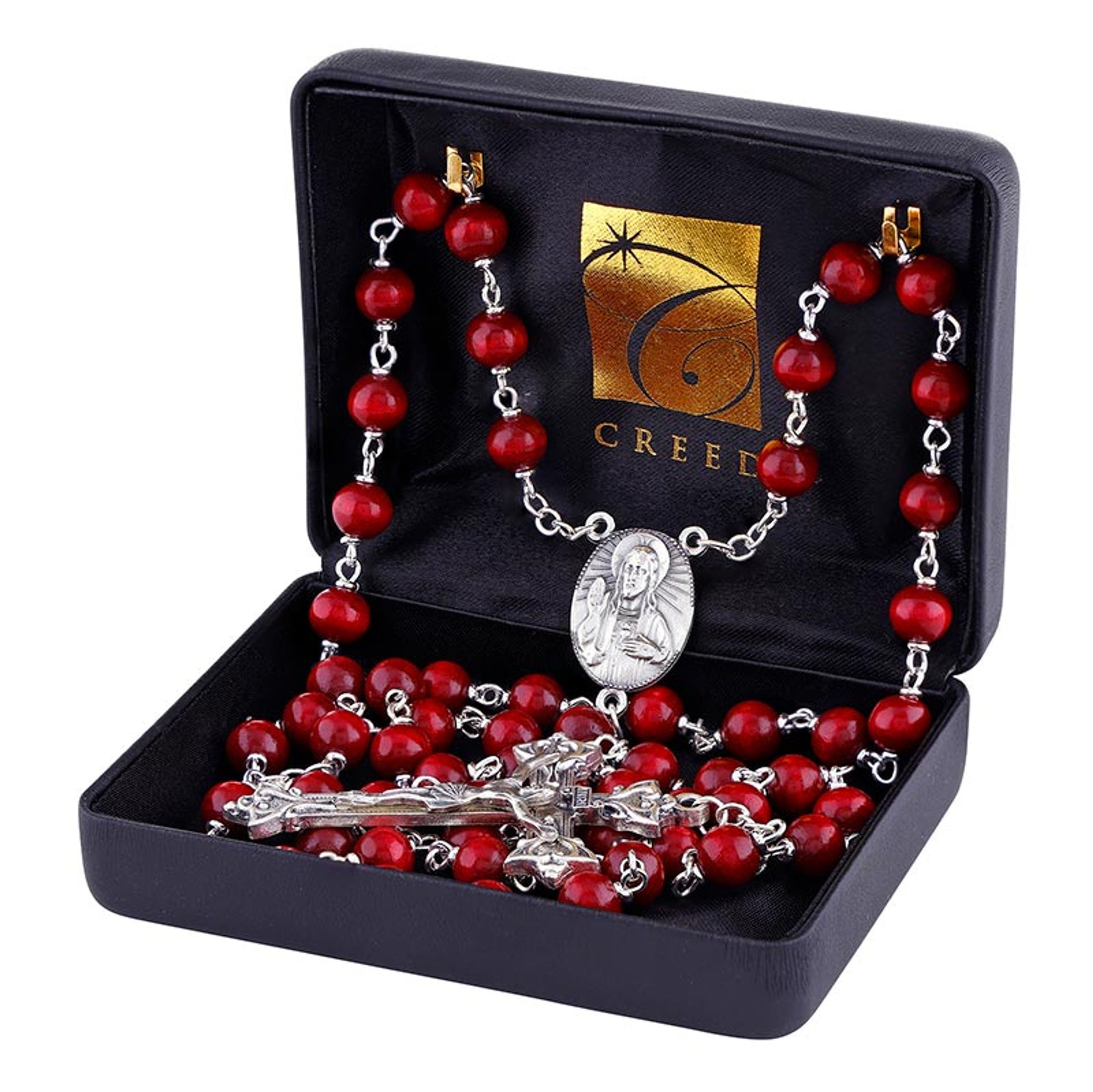 Size: 8mm Rose Wood Bead, 22.25" L, 2.25" Crucifix, 1" Sacred Heart Centerpiece