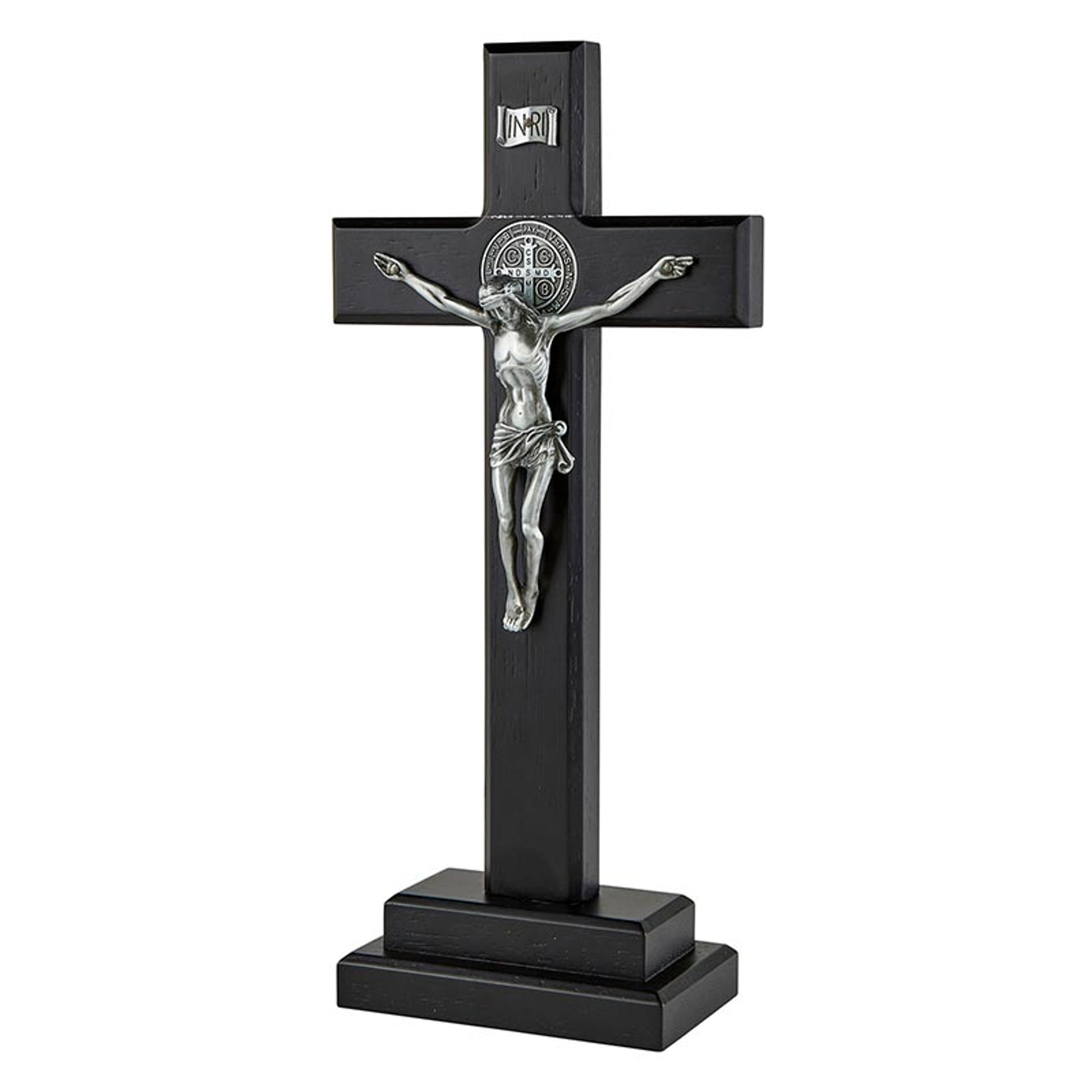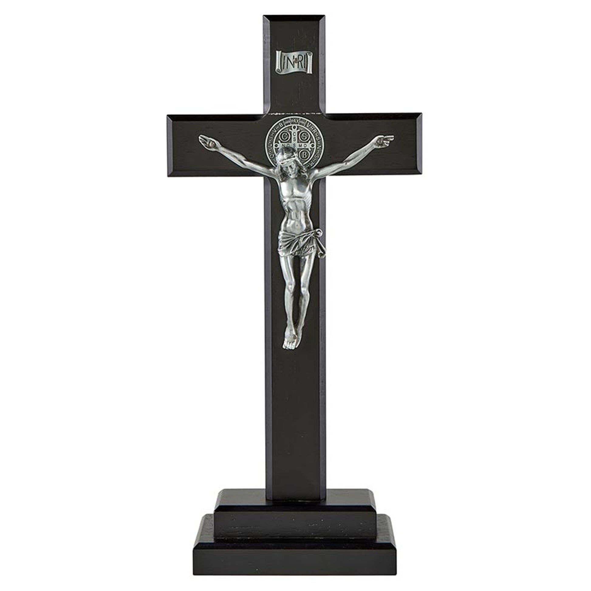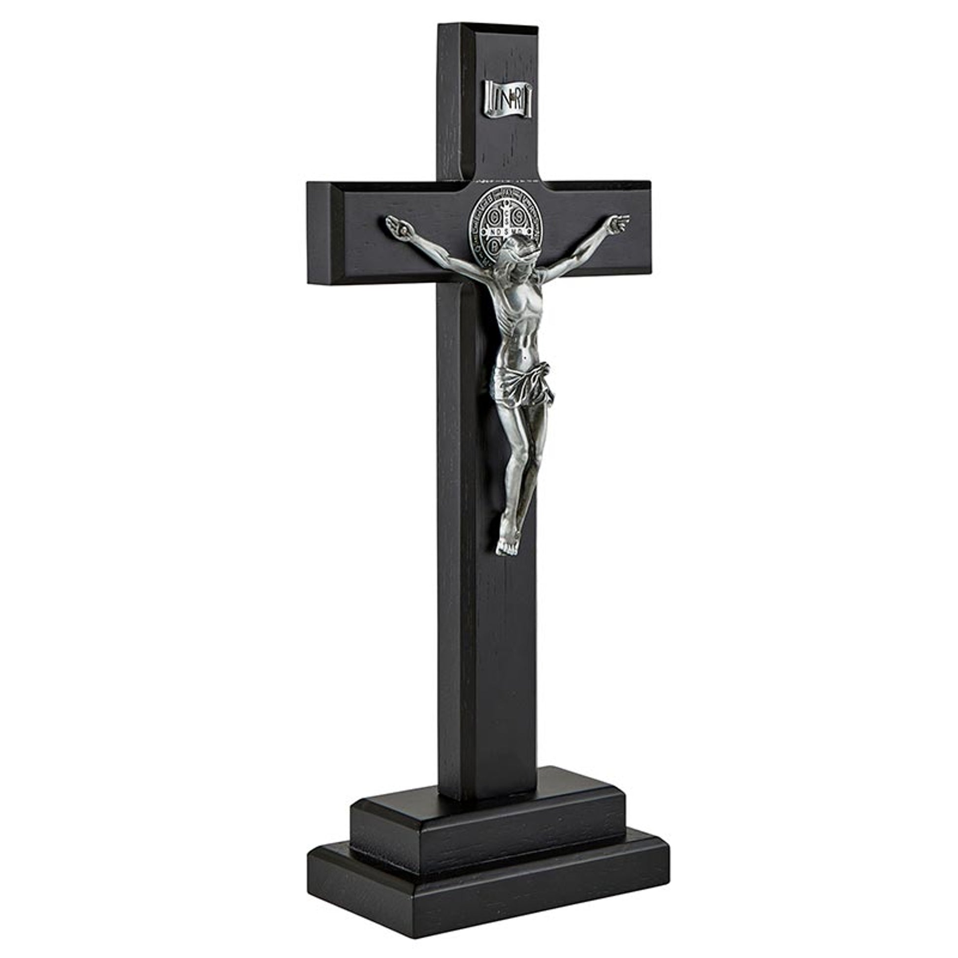 This Saint Benedict Standing Crucifix is 13 3/4 inches tall and features antique pewter finish corpus on a black finish maple hardwood cross.