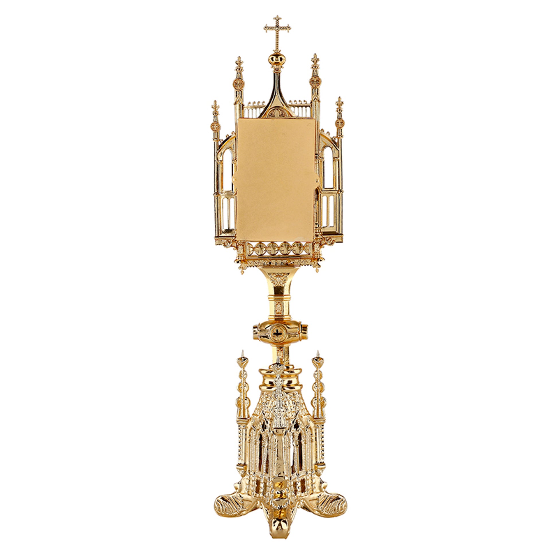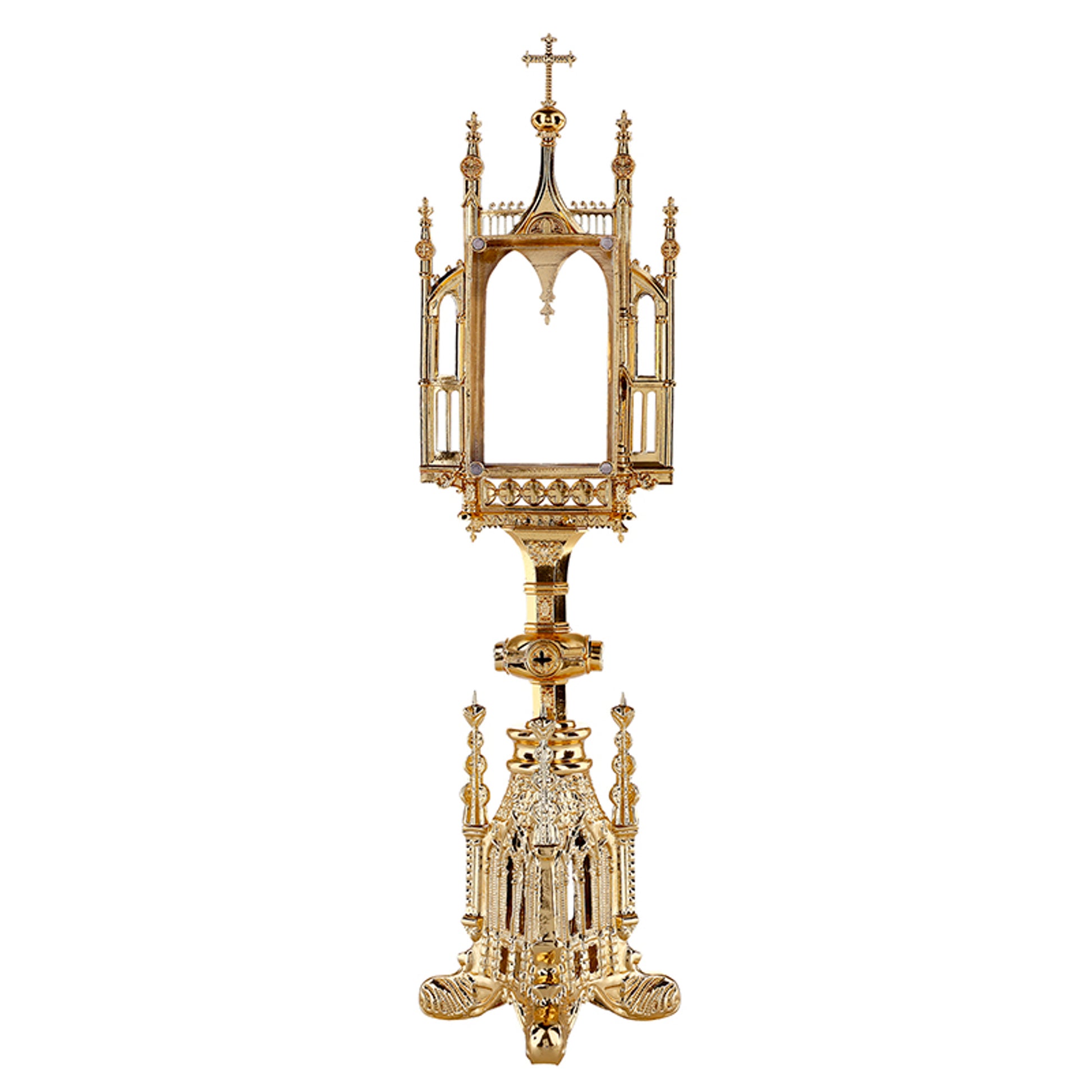 Beautiful reliquaries are designed to contain the relics of the Saints or other sacred objects. Relics can be parts of the bodies of the saints, something they used or objects that have been touched by their bodies. Scripture attests to the healing power of objects touched by Jesus or His apostles. Please note that a reliquary is not equipped with a luna.Sudbury Brass??????? offers this handcrafted reliquary made from solid brass with a high polished finish. The reliquary features a distinctive design reminiscent of Old World cathedral architectural elements. It is a beautiful addition to any church or chapel.