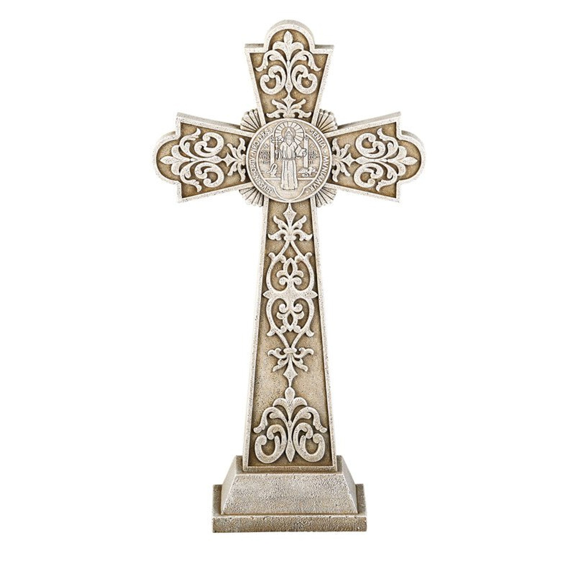 The Saint Benedict garden cross helps create instant serenity by accenting a garden or patio space. From Avalon Gallery® this stoneresin piece is ideal for sun or shade, yet durable featuring a subtle outdoor finish which will be treasured for years to come. Cross features on one side the medal with image of St. Benedict and the reverse side, are the initial letters of a rhythmic Latin prayer. Comes boxed for easy storage or gift giving.