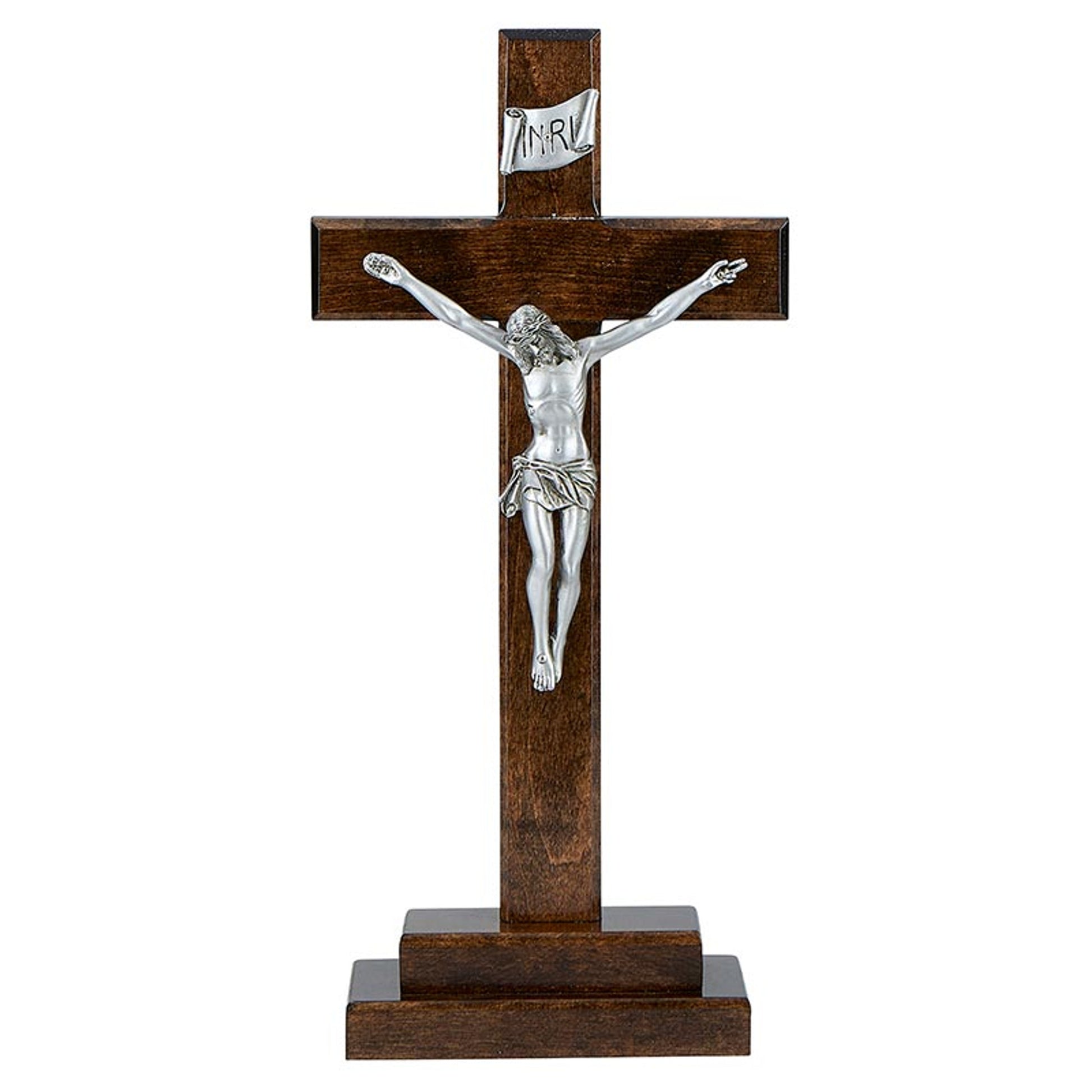 This Standing Crucifix is 13 inches tall and features antique pewter finish corpus on a walnut finish maple hardwood cross.