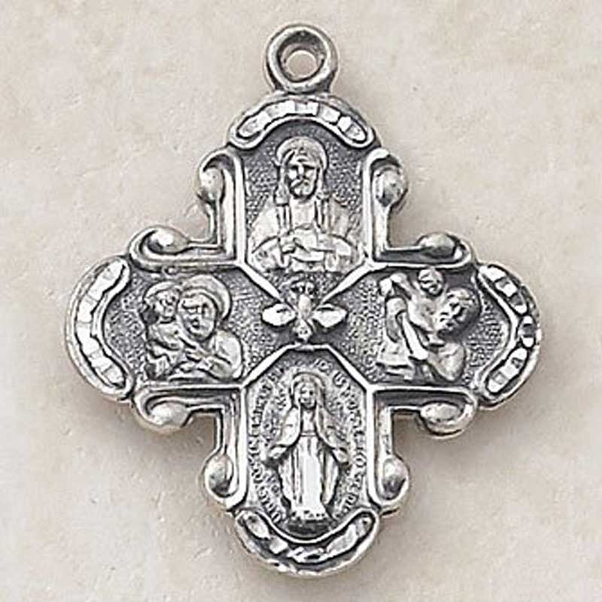 One of the most popular types of religious medals is commonly known as the Four-Way Medal (4-Way Medal). This one medal combines the bulk of four or five medals into one convenient piece. Individually the medals would be heavy to wear and costly to buy, but together they form a simply beautiful pendant. Arranged in the shape of a cross, the Four-Way medal can vary in appearance, however the most popular form includes a Sacred Heart of Jesus medal, St. Christopher medal, St. Joseph medal and the Miraculous Medal. Some Four-Way medals that are designed for First Communion or Confirmation gifts may have a chalice or dove at the center of the cross. The reverse side of the medal will often contain the inscription "I am a Catholic, please call a priest." This traditional message is included in case of emergency so first responders will know to call a priest to administer the Sacraments.