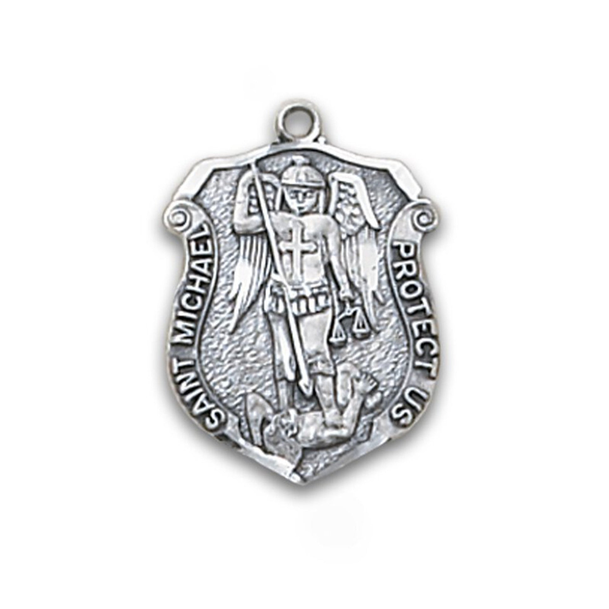 Our Creed® collection of sterling medals are both elegant and traditional, and designed for anyone.St. Michael is one of the principal angels of God and the leader of His heavenly army. He is mentioned four times in scripture and, along with Gabriel and Raphael, is one of three archangels venerated liturgically in the Church. His name (Hebrew for "who is like God?") comes from his and the good angels' war cry in the heavenly battle against Satan and his demons mentioned the book of Revelation.Christian tradition assigns to St. Michael four main duties: fighting against Satan, defending God's people (first Israel, now the Church), rescuing souls from the power of the Enemy, especially at the hour of death, and bringing all souls to judgment as the angel of death. Because he is the protector and defender of God's people as well as the angel who brings souls to judgment, St. Michael the Archangel is recognized today as the patron of soldiers, security guards, police officers and paramedics.Comes with 18" Chain.